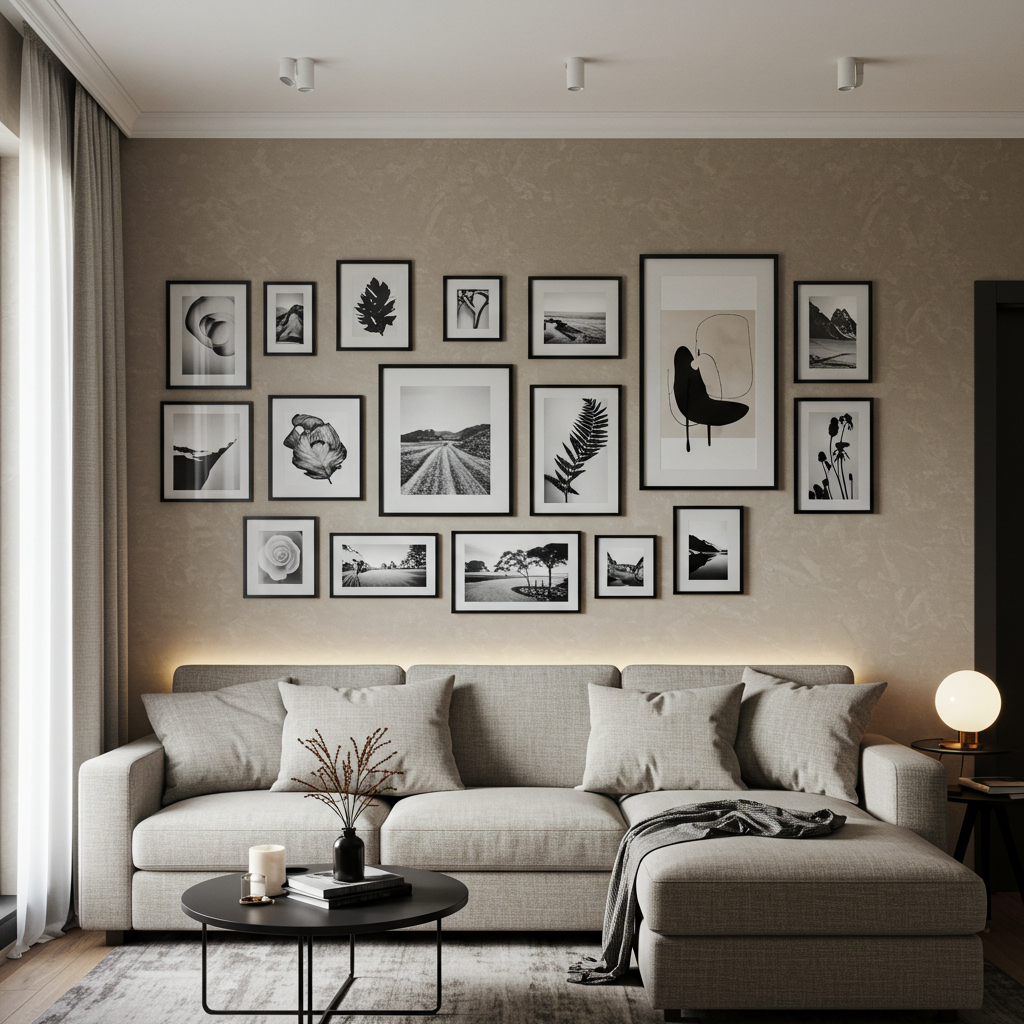 - 액자를 바닥에 배열해보고 마음에 드는 구도를 찾습니다.